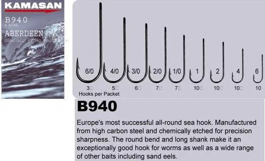 Kamasan B940 Aberdeens are Europe’s most successful all-round sea fishing hook. They are manufactured from high carbon steel and chemically etched to have a needle sharp point. They have a round bend, long shank and prominent barb, making them ideal to use with a wide range of baits including rag worms and sand eels. For all-round sea fishing in the UK and Ireland.